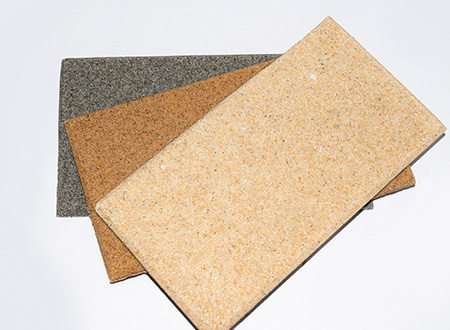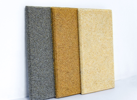 微粒材料是一種新型綠色裝飾材料,具備優(yōu)異的聲學(xué)性和物理性能。該材料是以天然砂粒或經(jīng)環(huán)保處理的固廢顆粒為骨料,以環(huán)保膠凝劑,通過壓振工藝,生產(chǎn)的具有大量相互連通的微小空隙的多孔材料。